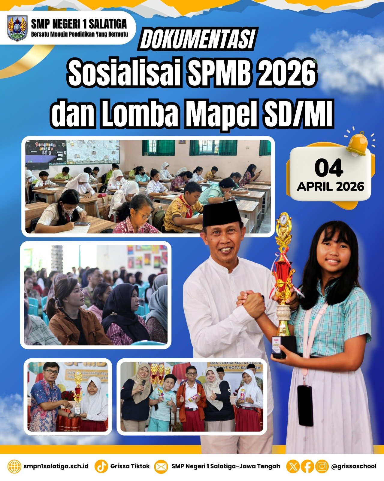 Dalam rangka menyambut tahun pelajaran 2026/2027, SMP Negeri 1 Salatiga sukses menyelenggarakan kegiatan sosialisasi Sistem Penerimaan Murid Baru (SPMB) pada Sabtu, 4 April 2026. Bertempat di bangsal dan ruang-ruang kelas, acara ini dihadiri oleh ratusan orang tua calon siswa dan siswa SD se-Kota Salatiga.
